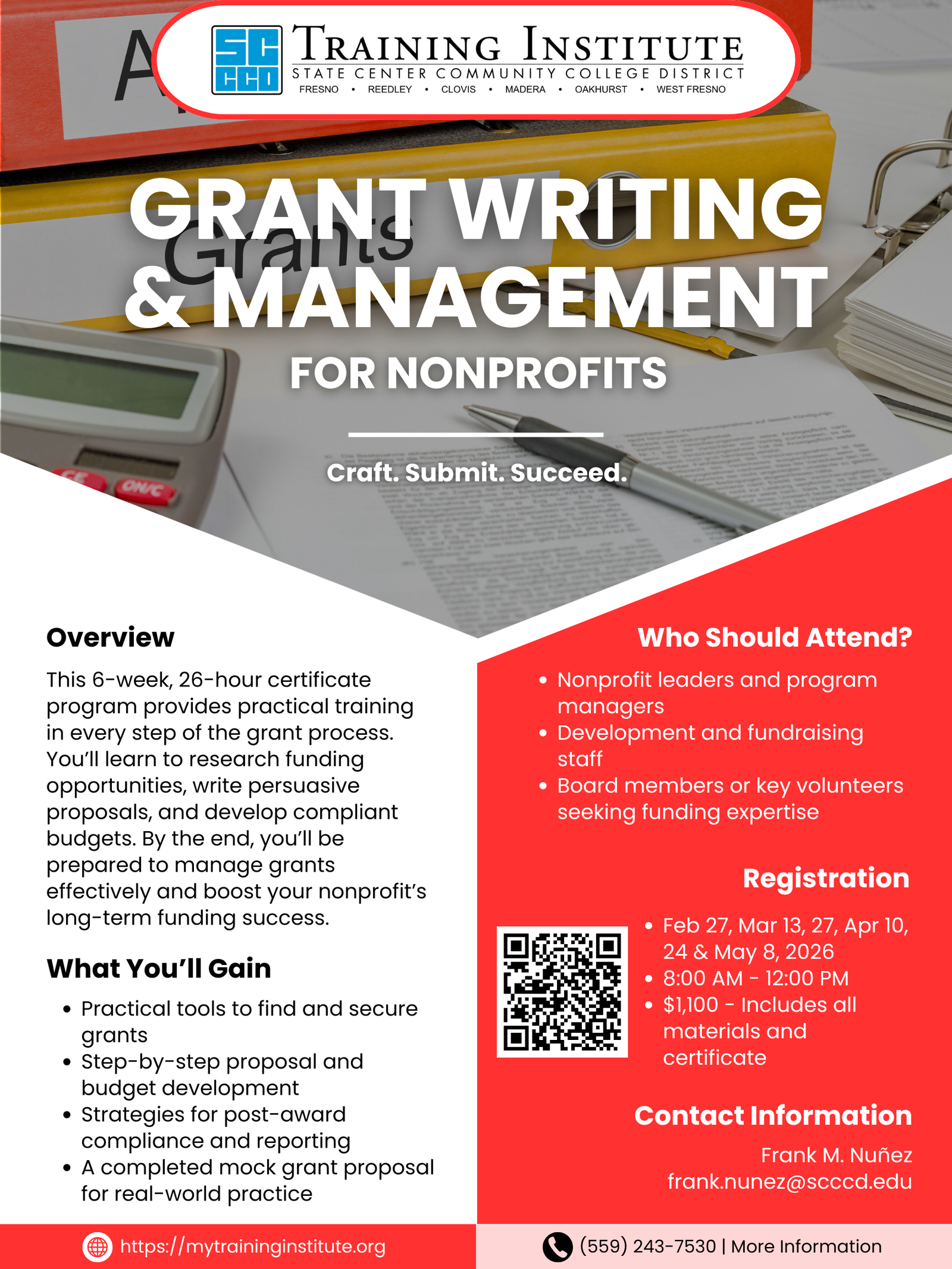 The Grant Writing & Management for Nonprofits Certificate equips participants with practical, hands-on training to research funding opportunities, write persuasive proposals, develop compliant budgets, and manage awarded grants. Over six sessions, you’ll create a complete mock grant proposal, gaining tools and real-world experience to strengthen your nonprofit’s financial sustainability.